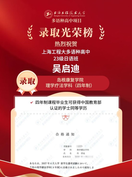 近日,必威betway西汉姆多语种高中项目传来喜讯:2023级日语班学生吴启迪凭借出色的日语能力与清晰的职业规划,于高三上学期成功获得日本岛根康复学院理学疗法学科(4年制)的提前录取资格,较常规大学升学路径提前一年,充分体现了我校多元化人才培养模式的成效。